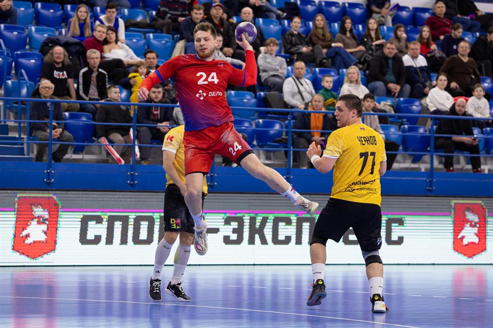 Как и в первой встрече в Краснодаре, стартовый отрезок первого тайма ответной дуэли в этой паре прошел в упорной борьбе. На этот раз Степан Сидорчук сразу же сделал ставку на игру в атаке в формате 7 на 6, но это привело лишь к двум результативным броскам красно-синих по пустым воротам. А вот первый гол с игры москвичи добыли для себя лишь на 6-й минуте. Спустя несколько атак гости добыли для себя перевес в пару мячей, но достаточно быстро его растеряли. А к концу первой трети игры ЦСКА уже оторвался в счете на четыре мяча, что вынудило тренерский штаб гостей производить новые перестановки. К тому моменту в воротах хозяев разыгрался Дмитрий Холмов, выдавший серию ярких спасений. В атаке же Дмитрий Ионов и Даниил Шишкарёв оформили по шесть голов к перерыву, соорудив две трети общекомандных голов к перерыву.